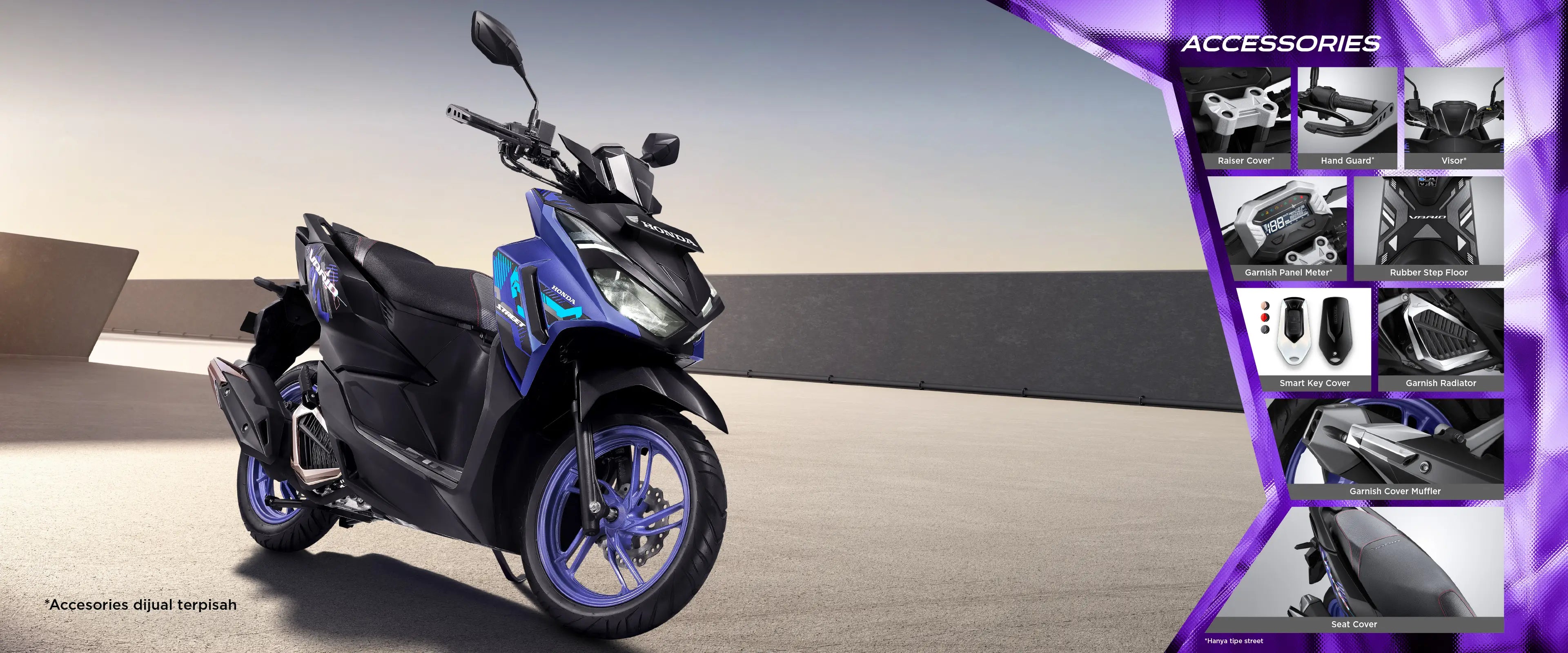 Nah, yang paling menarik perhatian pasti varian Street-nya. Varian ini ngusung konsep street-style yang terkesan kuat, ekspresif, dan penuh energi. Ciri khasnya ada di setang naked handlebar dan panel meter terpisah, plus velg dengan warna yang eye-catching. Cocok banget buat anak muda yang pengin tampil beda dan punya gaya berkendara yang lebih personal.